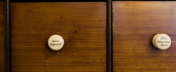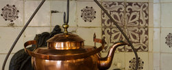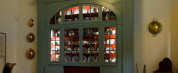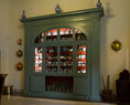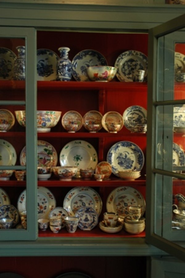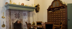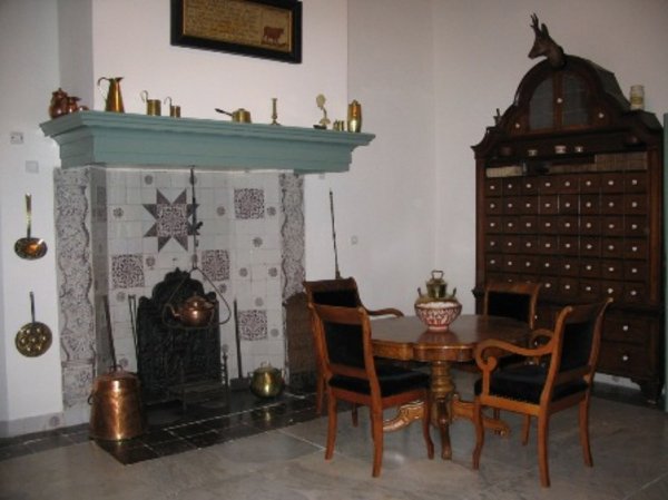 De haard is versierd met een uniek 17de eeuws Makkumer tegeltableau. In de vaste kast staat het gebruiksporselein en de tinnen borden. De grote apothekerskast komt uit het voormalig Psychiatrisch Ziekenhuis in Franeker.