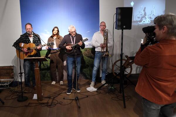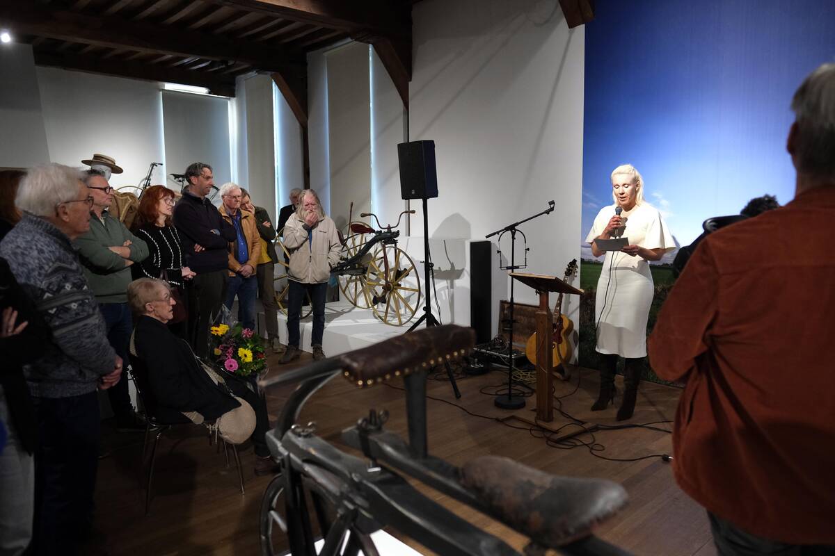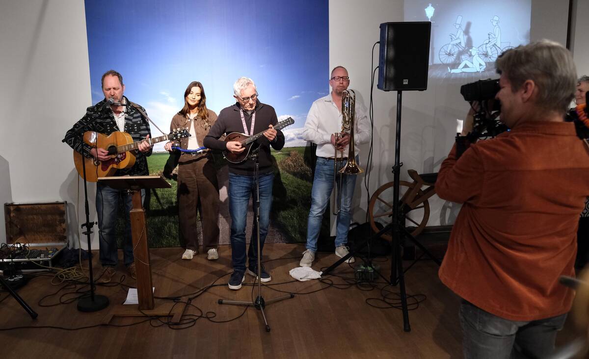 Een laatste vrolijke noot klonk door Jilt Heidstra, schrijver van het nummer 'Blauwe Fiets', dat hij speciaal voor de tentoonstelling componeerde. Hij werd daarbij muzikaal begeleid door Lando Bron, Gjalt Bosma en gastfietsbeller (en marketeer van het museum) Alma Wiersma.